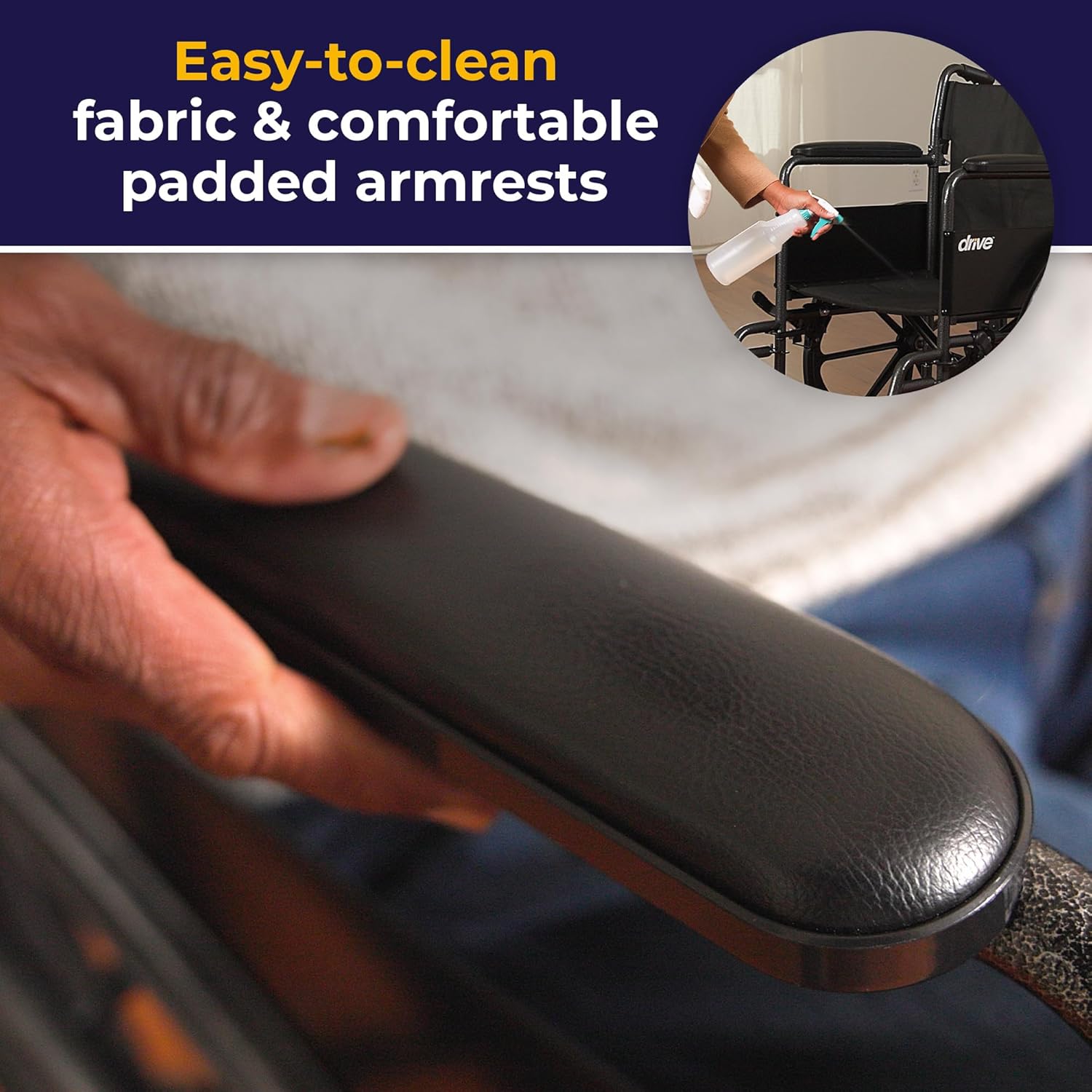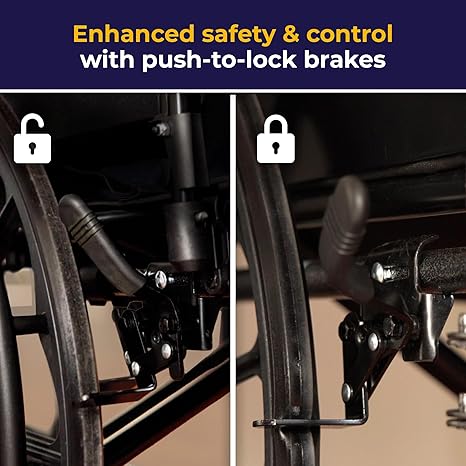This folding transport wheelchair combines lightweight design with durable construction for easy, independent mobility. Its powder-coated silver vein steel frame weighs just 37.6 lbs, ensuring both strength and portability. Equipped with padded arms and nylon upholstery, it delivers superior support and comfort. The wheelchair features urethane tires on composite wheels for long-lasting performance and low maintenance, along with convenient push-to-lock wheel locks for safety. Additional features like a carry pocket on the backrest and folding back canes simplify transport and storage, making it an excellent choice for seniors and adults.